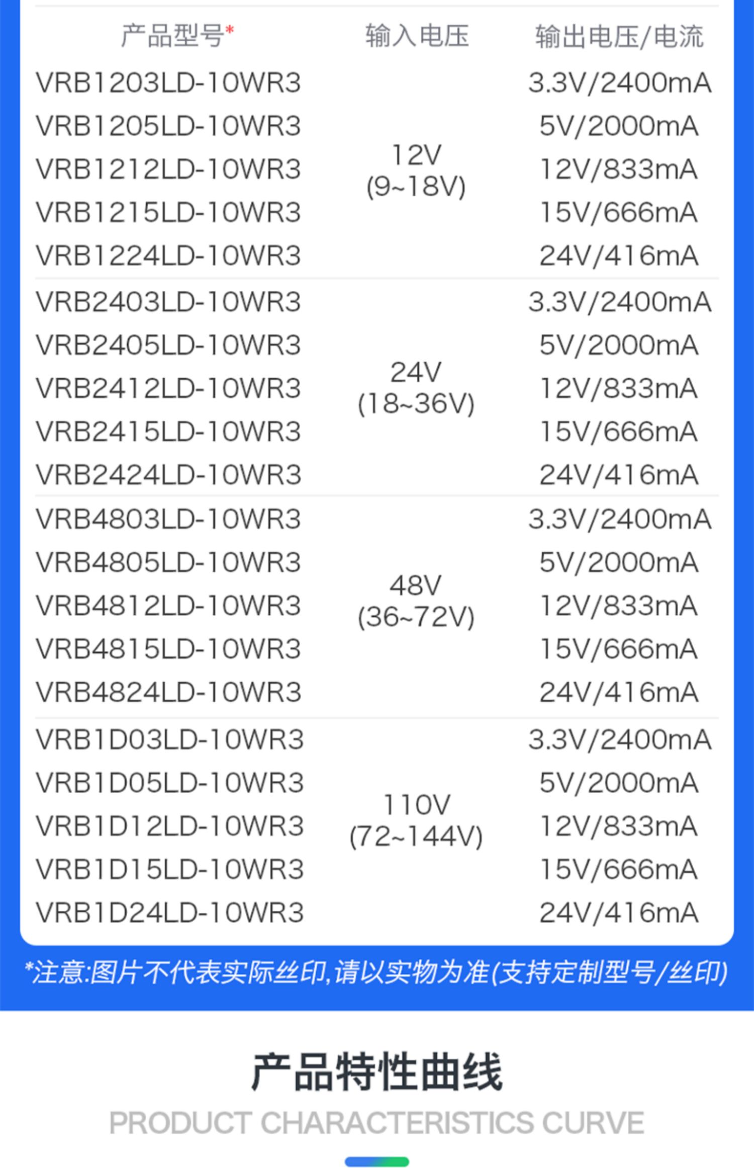 VR(A)B_LD-10WR3系列产品输出功率为 10W,2:1宽电压输入范围,效率高达86%,1500VDC的常规隔离电压,允许工作温度-40°Cto+85℃,具有输出过流、短路保护功能,广泛应用于医疗、工控、电力、仪器仪表、通信、铁路等领域。