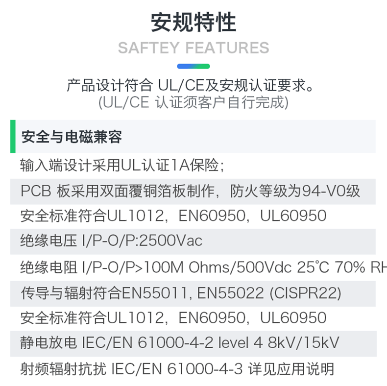 满足UL、CE 要求;产品设计满足EMC及安规测试要求