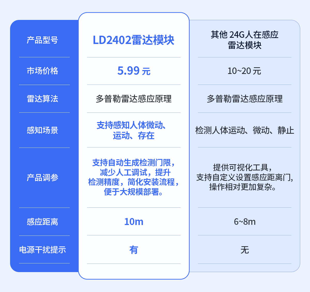 LD2402单价仅为5.9元,仅为市场上类型的产品价格的1/3左右,同时LD2402性能上全方位提升,感应距离可达10m,新增了自动生成门限和电池干扰提示功能,不管是价格、性能还是使用体验上LD2402都更具优势。