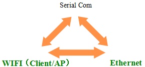 本产品是基于通用串行接口的符合网络标准的嵌入式模块,内置TCP/IP协议栈,能够实现用户串口、以太网、无线网(WIFI)3个接口之间的任意转换。