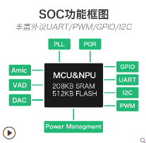 模组采用MCU+语音识别专用NPU架构内核,采用超低功耗制程工艺,内置高精度语音检测模块,配合系统多级启动模式,使芯片待机功耗进入亚毫瓦级,工作功耗几毫瓦级别,芯片内置SRAM和FLASH只需少量外围器件即可形成完整解决方案。