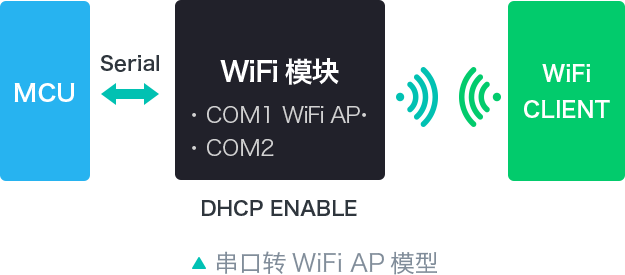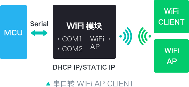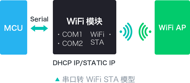 ·此模式下,WiFi设备能连接到模块AP,成为WiFi局域网下的设备。