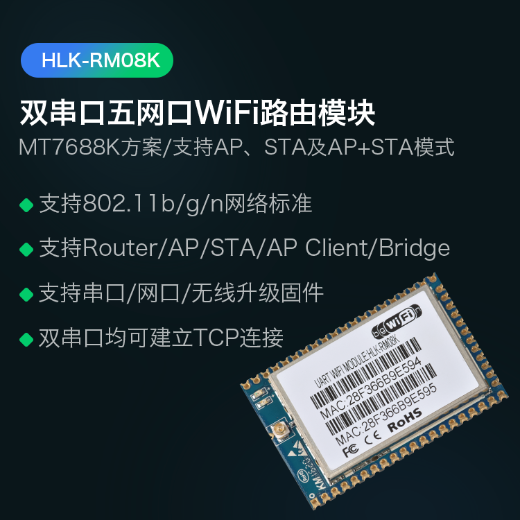 HLK-RM08K是基于通用串行接口符合网络标准的嵌入式WiFi模块,内置TCP/IP协议栈,可实现串口、以太网、WiFi接口之间的相互转换