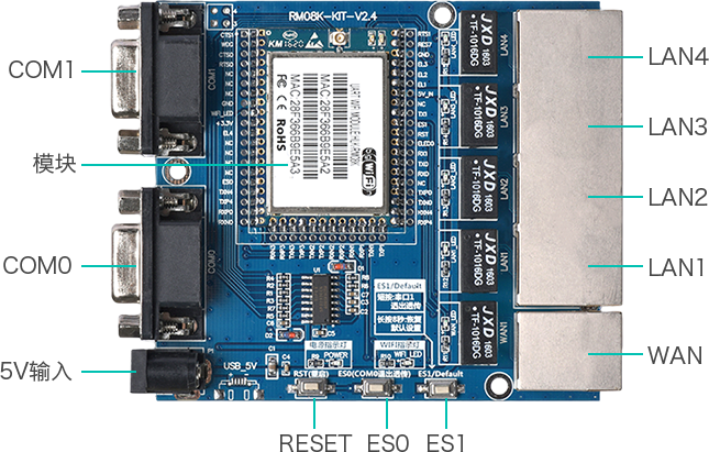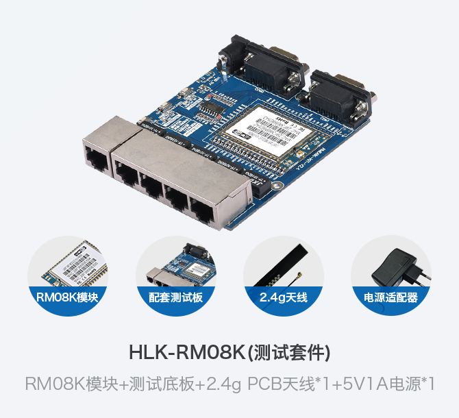 RM08K模块+ 功能测试底板+5V1A电源适配器+2.4G天线*1(标准套件)