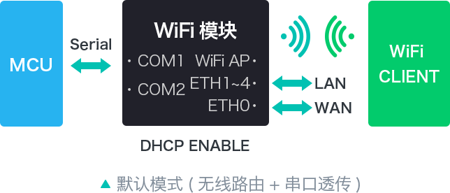 ·此模式下,WiFi设备能连接到模块,成为WiFi局域网下的设备;WAN 端默认动态IP地址方式。LAN、WiFi为同一局域网,默认开启DHCP服务器。