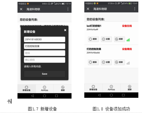 一起提供。图1.7为扫描二维码之后出现的界面,如图所示,设备地址以及设备名称默认已经设置,您可以修改设备名称,MAC地址一般不建议修改。同时输入提供的默认密码提交即可成功添加设备。图1.8为设备添加成功所实际显示的效果。可以删除设备、修改密码及刷新设备状态。