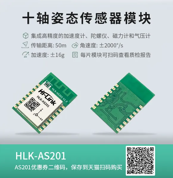 HLK-AS201模块已经在各大平台全面上架,原价45.8元,活动优惠价低至35.8元,保存上方二维码到淘宝即可领券购买! ONE 产品功能 陀螺仪也被称为运动传感器,主要是用来测量物体的旋转方向、旋转角速度,了解当前设备的位置、方位和运行速度。 HLK-AS201陀螺仪以x轴、y轴、z轴三个轴为基点,测量物体的运行速度和姿态。 每个轴对不同方位的角度进行测量,实时输出x轴、y轴、z轴的角速度和加速度数据,以及三个轴的磁场数据和四元数数据,从而可以获得设备在三维空间中的旋转角度和姿态角变化。 TWO 产品特点 高度集成 轻量化 HLK-AS201姿态陀螺仪模块,高度集成三轴加速度计、三轴陀螺仪、三轴磁力计和一轴气压计。 模块体积小巧,大小仅24x16x2mm,重量2g,大幅度节省设计空间。 高稳定性 高精准度 HLK-AS201姿态陀螺仪模块,Z轴航向角加入地磁传感器滤波融合,解决了6轴算法中,由于陀螺仪积分的漂移引起的累计误差,可长期稳定输出航向角数据。 模块的加速度 0.01g(即0.098m/s2),角速度:0.03°/s,欧拉角 X和Y角度:+1°,Z角度:+5°(无磁干扰时),温 度:0.01°℃'C(板上温度),气压:0.006hPa,高 度:0.05m(气压稳定时)。 APP调参 测试简单 在具体的应用过程中,需要先查看每个AS201模块上面二维码的质检报告,首次使用建议使用pc版雷竞技什么时候出来